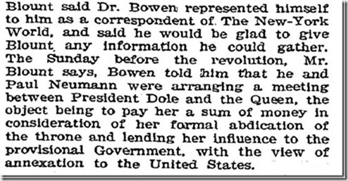 On July 4, 1894, the Republic of Hawaii was declared, with Sanford B. Dole as president. The illegal overthrow of the independent nation of Hawaii was complete.Yes, although your daily paper may want you to forget this, it is history that should not be ignored. There’s even a federal law confirming the truth of the history they refuse to print.From the Apology Resolution , United States Public Law 103-150:A treaty of annexation was never passed by Congress, and President Grover Cleveland withdrew the treaty. Then on this day in history…What was the motivation? Need you ask? Why is the US in Iraq?From the Washington Post review of Overthrow:The road leading up to the declaration of the Republic of Hawaii was rocky, and can’t be summed up in a short blog article. Did you know, for example, that a US Senate investigation revealed that a bribe had been offered to Queen Liliuokalani to turn against her people and support the Republic? This snip is from a New York Times article on the Senate investigation, dated 1/29/1894:The declaration of the Republic was not a single, static event. There was considerable debate in Congress on resolutions condemning the overthrow and proposed annexation. For example, this snip from the 1/25/1894 New York Times will give you an idea of the complexity that we lose in simplifying Hawaii’s history:Each article is much longer than the snips above. It would be worthwhile to skim the New York Times for a complete account of the Congressional debate. No doubt this has already been done. If not, the articles are available on-line for the harvesting..If you’re not familiar with Hawaiian history, beware of websites that work hard to re-write it. The true picture of the overthrow is not pretty, nor can the acts of the US government be justified or whitewashed. Google cautiously.Let your children know that there is more to July 4 than barbeques and fireworks. It is a holiday that tears people apart here in Hawaii. See how you can work this history into your celebrations and festivities, so that it will never disappear.